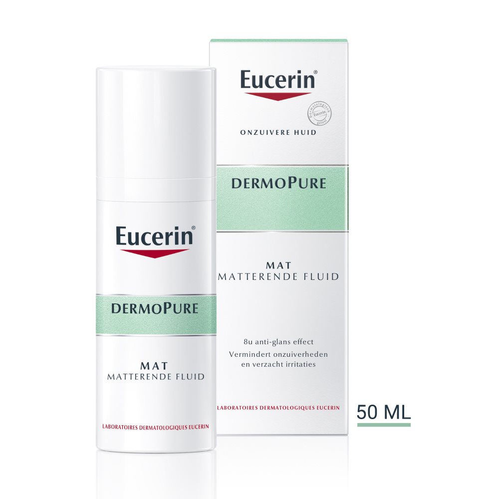 Eucerin DermoPure HYDRA aanvullende verzachtende crème is speciaal samengesteld voor een huid die is uitgedroogd en geïrriteerd door medische behandeling van acne. Eucerin DermoPure MAT Matterende fluid vermindert onzuiverheden en teveel aan talg.