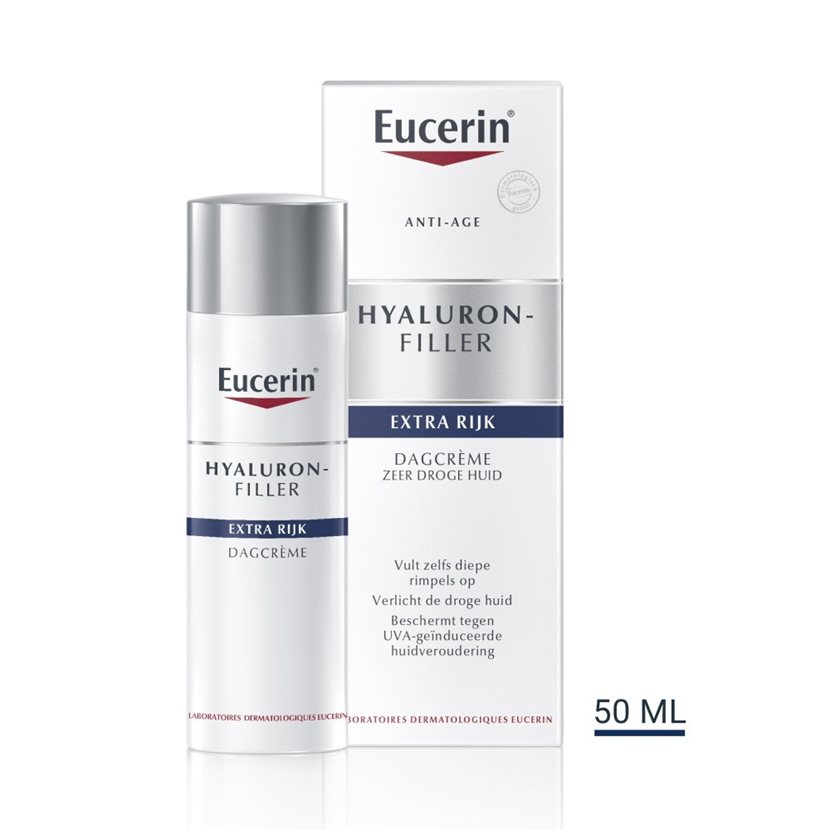 Naast het vochtinbrengende ureum en het rimpel verminderende hyaluronzuur, bevat Hyaluron-Filler Urea Antirimpel Dagcrème zeer doeltreffende UVA-filters die beschermen tegen huidveroudering door UVA-licht. Eucerin Hyaluron-Filler Urea Antirimpel Nachtcrème bevat eveneens ureum en hyaluronzuur, maar bevat ook ceramide-3 dat de huid gedurende de nacht herstelt.