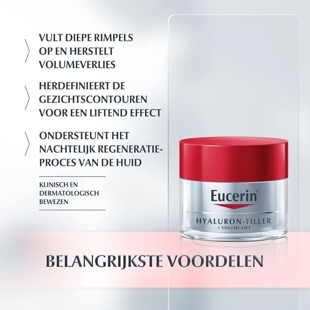 Breng Eucerin Hyaluron-Filler + Volume-Lift Nachtcrème aan, gevolgd door Eucerin Hyaluron-Filler + Volume-Lift Oogcontourcrème SPF 15.