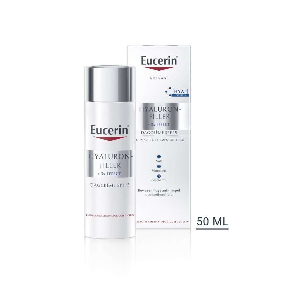 Naarmate we ouder worden, neemt de hoeveelheid natuurlijk Hyaluronzuur af, met verlies van vocht, fijne lijntjes en diepere rimpels als gevolg. Eucerin Hyaluron-Filler + 3x Effect Dagcrème SPF 15 is samengesteld voor de normale tot gemengde huid, hydrateert intensief en heeft rimpelopvullende effecten. De combinatie van hoog- en laagmoleculair Hyaluronzuur biedt een gerichte aanpak: maakt de huid glad en dringt in de diepere lagen van de opperhuid om zelfs uitgesproken rimpels op te vullen. Dankzij SPF 15 en UVA-filters helpt deze formule ook vroegtijdige huidveroudering veroorzaakt door dagelijkse blootstelling aan de zon te voorkomen. Deze crème zorgt er ook voor dat de huid de anti-age ingrediënten beter kan opnemen.
