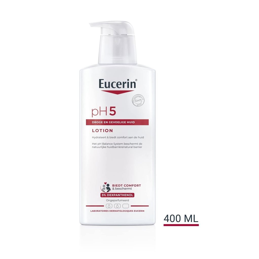 Body lotion voor droge, gevoelige huid Eucerin pH5 Bodylotion is een milde, maar doeltreffende bodylotion die specifiek is ontwikkeld voor de behoeften van de gevoelige lichaamshuid. Deze bevat pH5-enzymbescherming waarvan klinisch is bewezen dat deze de huideigen enzymen activeert. Door de natuurlijke afweer van de schrale huid van binnenuit te versterken, helpt deze formule bij het herstel van de pH-waarden, ondersteunt regeneratie en vult tot wel 24 uur lang de huideigen vochtopslag aan. Er is ook aangetoond dat deze de penetratie van pollen in de huid voor 90% voorkomt en is daarom geschikt voor gebruik op een door allergie aangetaste schrale huid. Dankzij dexpanthenol heeft de formule wondgenezende eigenschappen. Dagelijks gebruiken voor langdurige bescherming en een zachte, gladde huid.